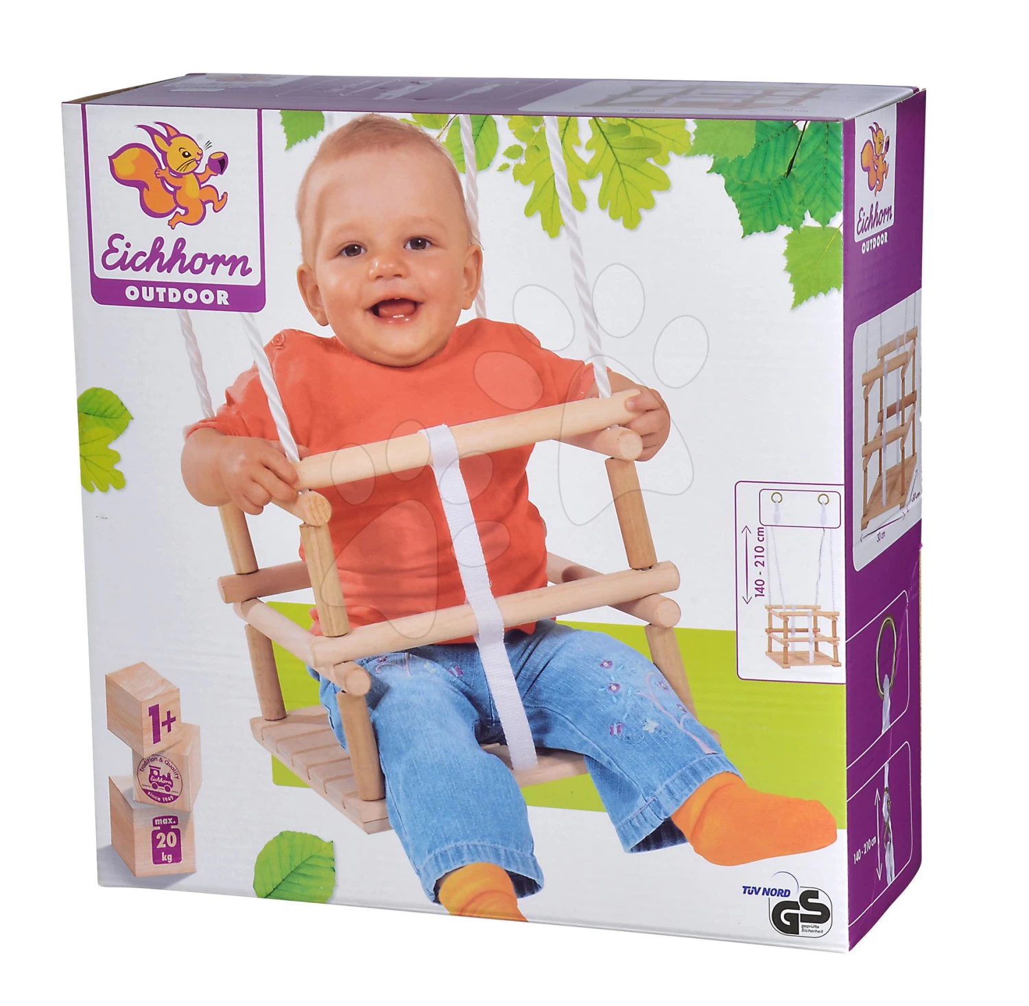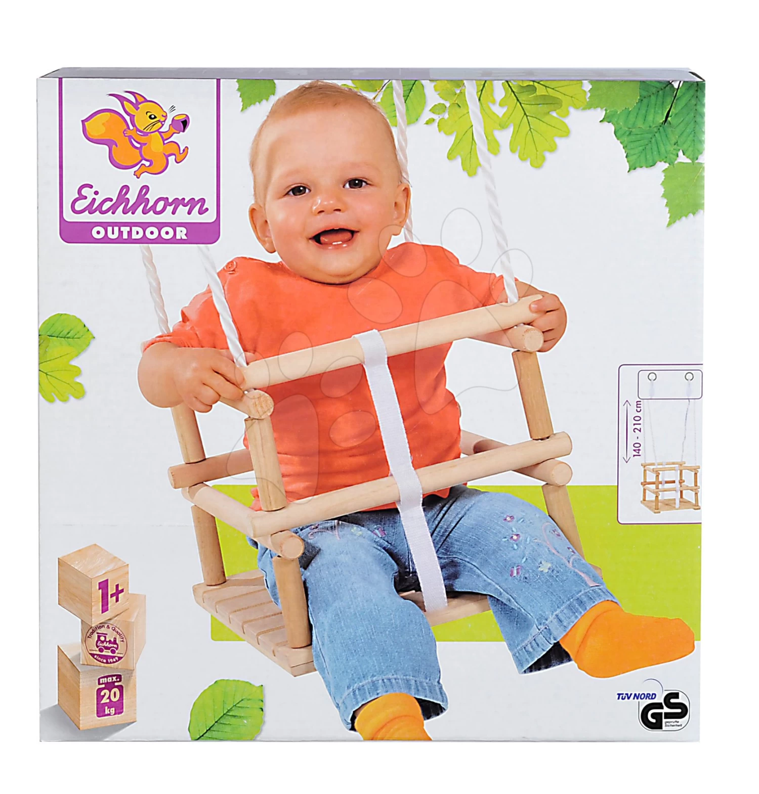 Hölzerne Schaukel Wooden Baby Swing Outdoor Eichhorn Natural 140-210 Cm Länge 30*30 Cm Sitz 20 Kg Tragfähigkeit Ab 12 Monaten
