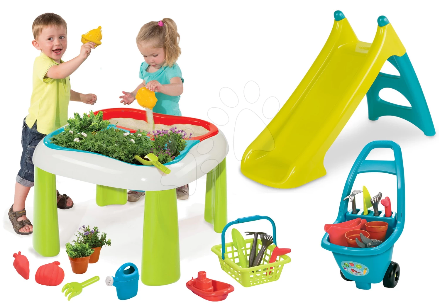 Tischset Gärtner De Jardinage 2in1 Smoby Zweiteilig Mit Garten Und Rutsche Toboggan XS Mit Wasser Und Trolley Mit Werkzeug