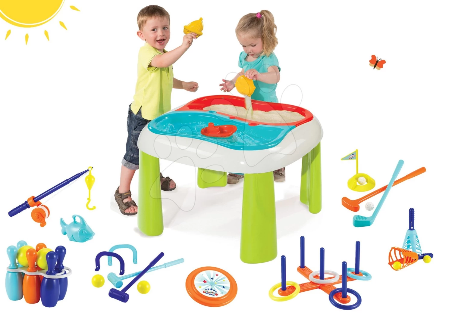 Tischset Water&Sand 2in1 Smoby Mit Einer Mühle Und Einem Sportset Mit 7 Spielen Von Jardin&Saisons Ab 18 Monaten